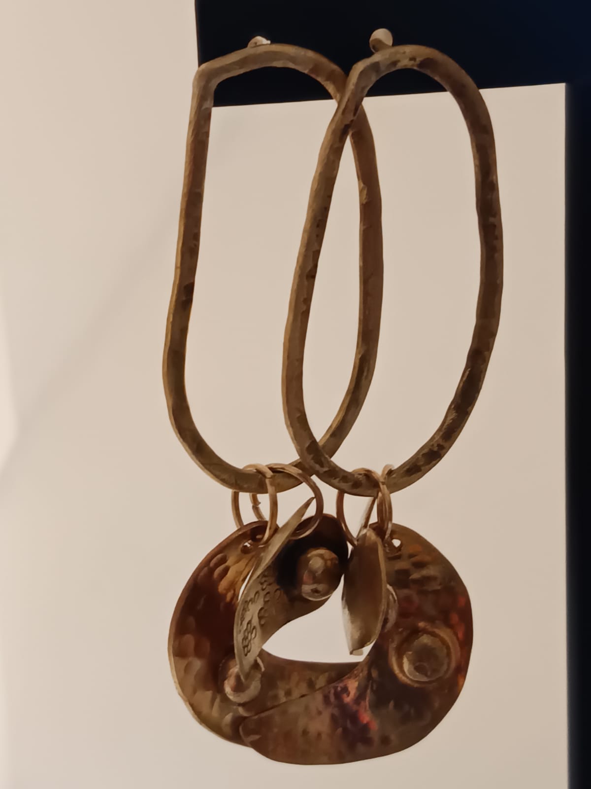 Aros elaborados en cobre amarillo, trabajados completamente a martillo, lo que genera texturas únicas e irrepetibles. Cada pieza es formada y ensamblada a mano, respetando el ritmo del material y su expresión natural.
