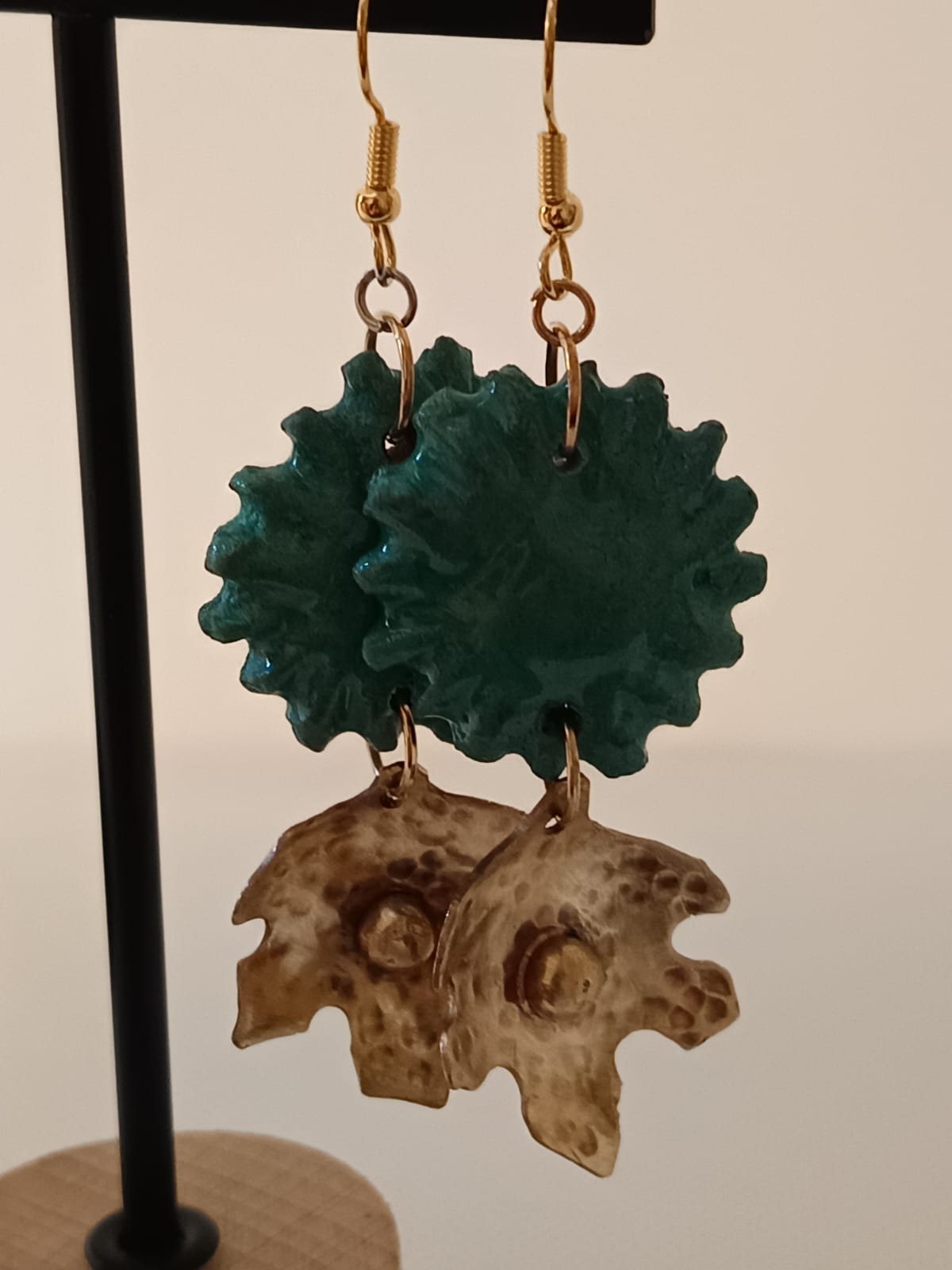 Realizados a mano en cobre y arcilla orgánica modelada, cada elemento conserva texturas vivas e irregulares que revelan el proceso artesanal. La superposición de formas crea un diálogo entre lo vegetal y lo simbólico.