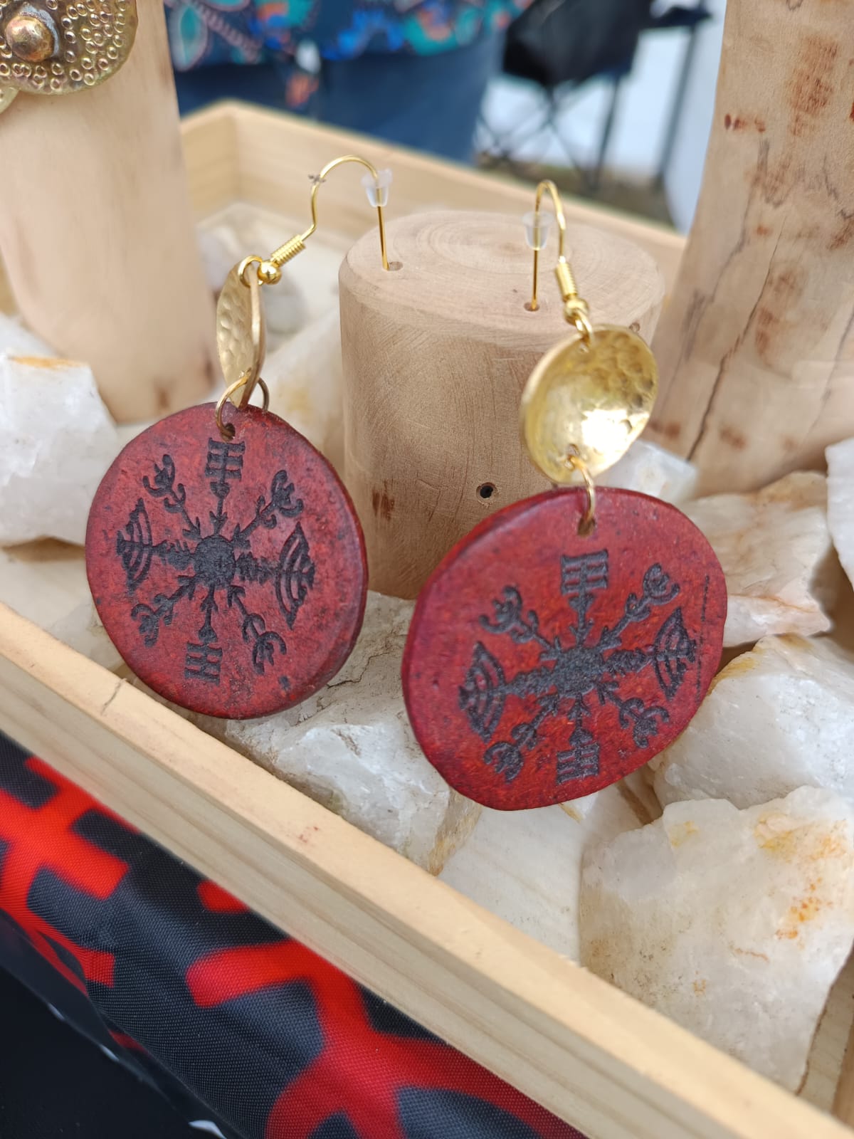 Los Aros Brújula Ancestral representan el viaje interior y la orientación espiritual. La pieza circular de arcilla orgánica, decorada con símbolos que evocan antiguas brújulas, se complementa con detalles de cobre amarillo, aportando calidez y fuerza visual.
