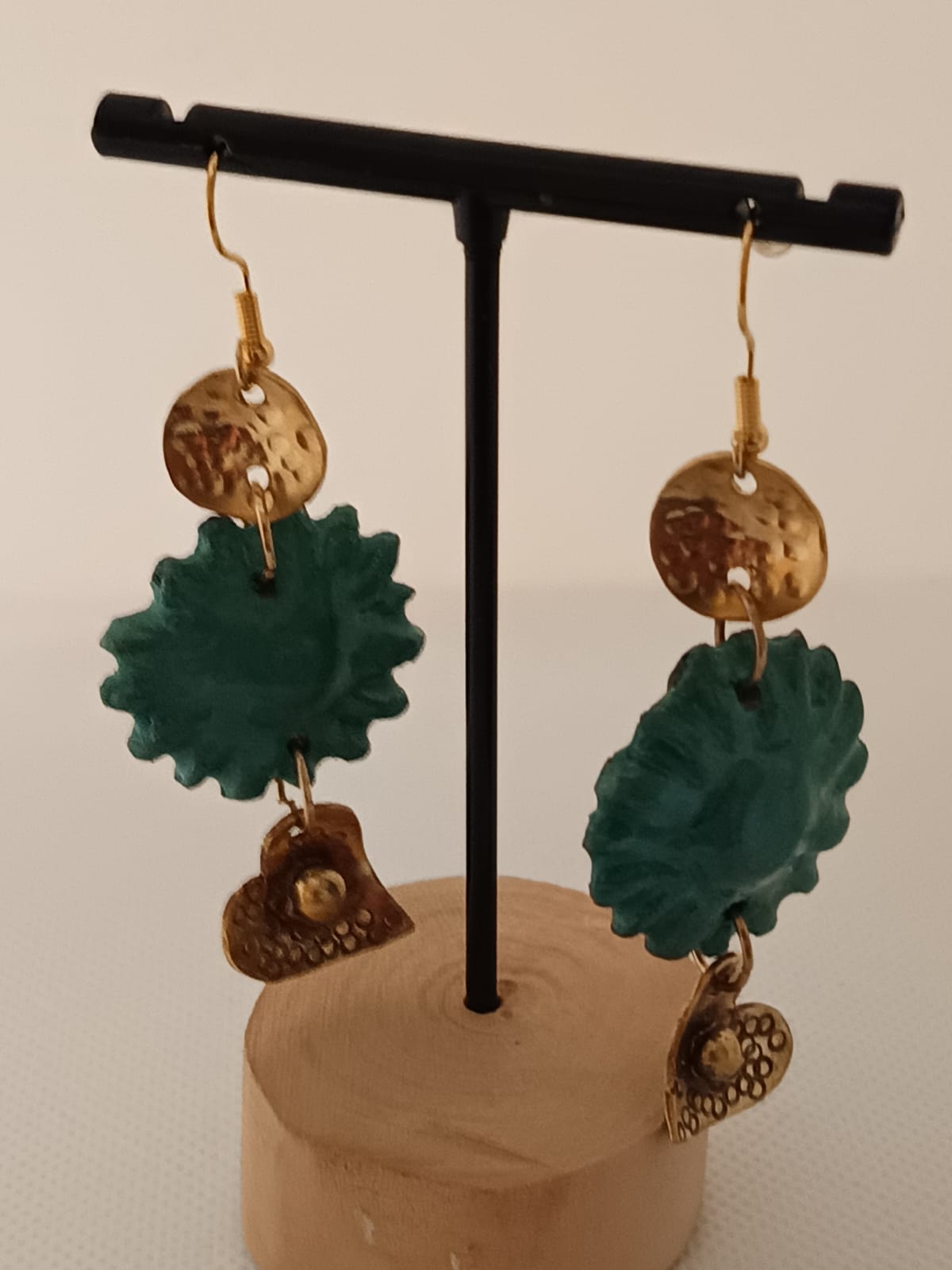 Pieza realizada en cobre trabajado a martillo, combinada con arcilla orgánica modelada a mano. Cada elemento conserva la huella del proceso artesanal, haciendo único cada par.
