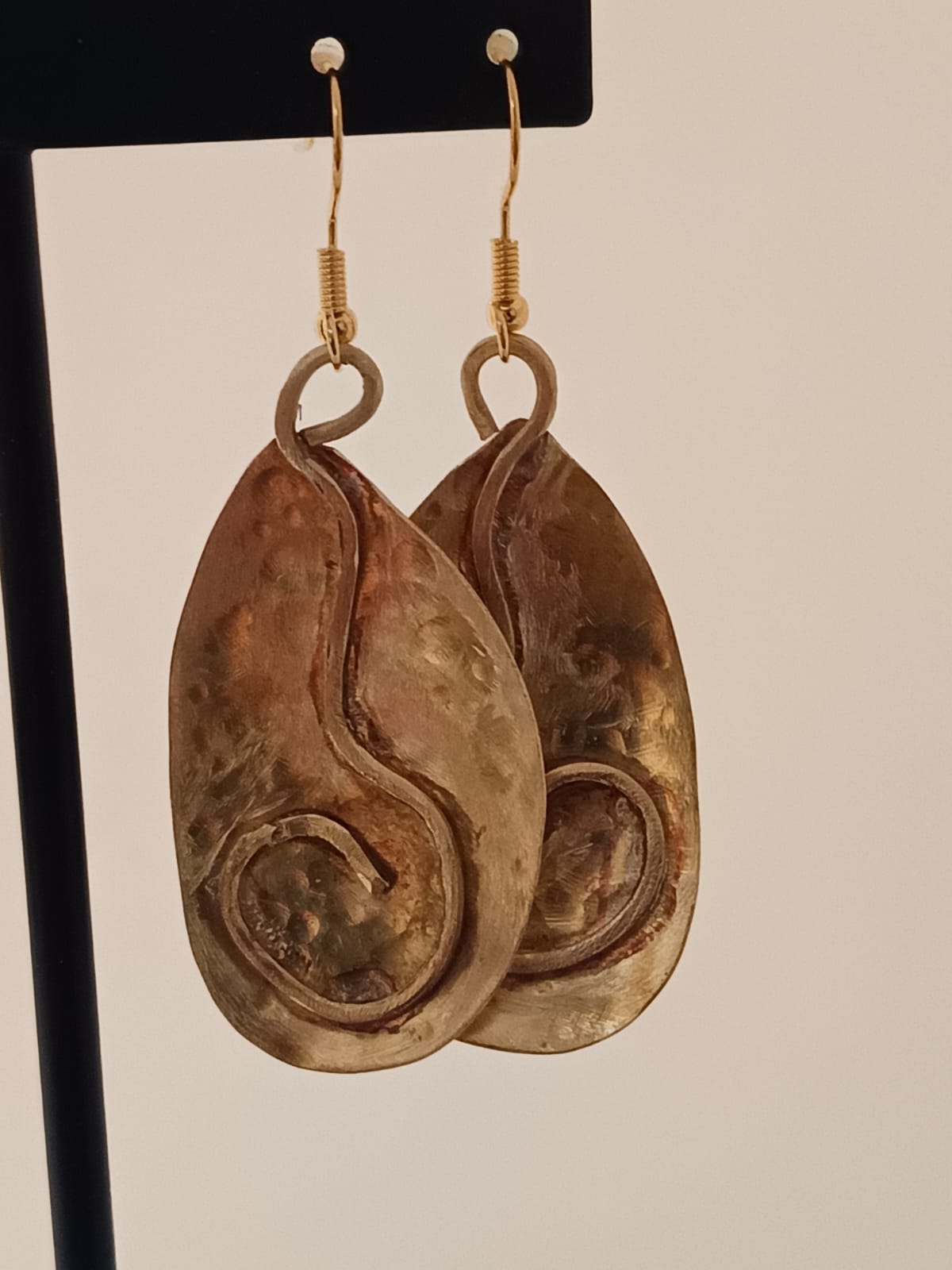 Cada aro está trabajado a mano en cobre, dando forma a una espiral orgánica que conserva la huella del martillo y del gesto manual. Las superficies irregulares y el acabado natural hacen que cada pieza sea única.