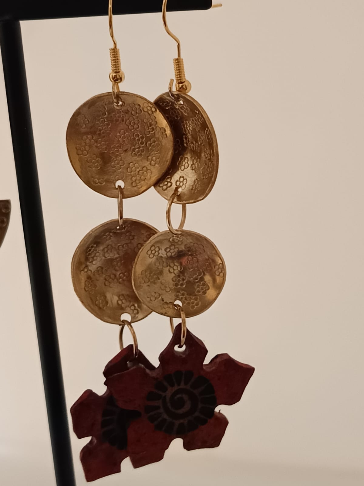 Discos metálicos texturados a mano, ensamblados de forma articulada. Cada pieza conserva las marcas del proceso, haciendo único cada par.