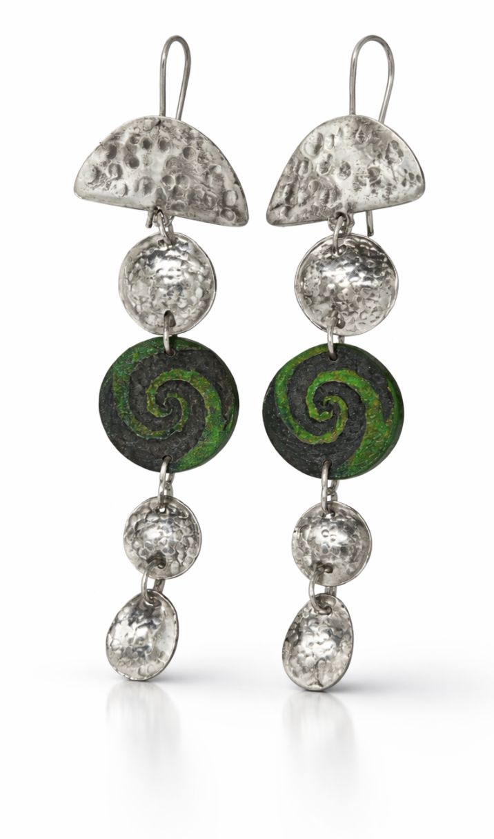 La arcilla orgánica se crea desde la mezcla de aserrín con ingredientes naturales, luego es moldeada, cocida a alta temperatura y pintada a mano, dando vida al motivo en espiral verde que simboliza movimiento, origen y conexión con la naturaleza. Finalmente, la arcilla se integra cuidadosamente con la plata, logrando una composición armónica y única.